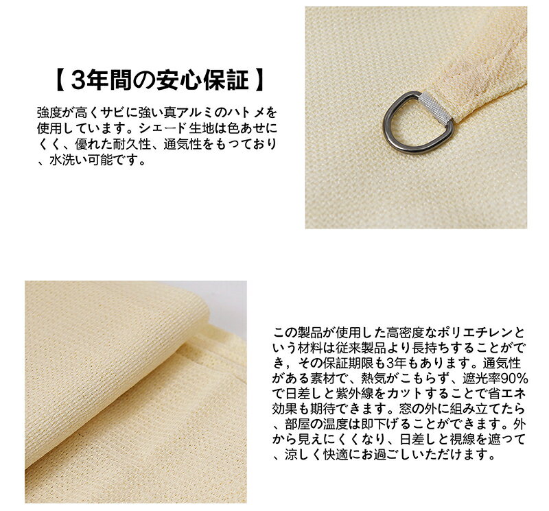 ・サイズ:3×3M ・素材:高密度ポリエチレン ・色:アイボリー ・3年保証、紫外線 UVカット率・約98%、遮光率・約90% ・1)この製品が使用した高密度なポリエチレンという材料は従来製品より長持ちすることができ、その保証期限も3年もあります ・2)UVカット製品で温度を下げるには重要な役に立っています。
