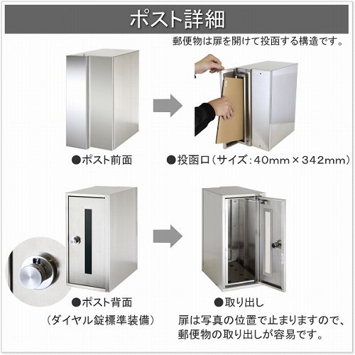 商 品 詳 細商品名【ポスタ グレイン type01 クスノキ】 NA1-PS01KSサイズ(mm)W190×H1205+埋め込み300×D342重量(kg)8.4材質ポスト部:扉:ステンレス(ヘアライン仕上げ) 支柱:アルミ(塩化ビニル)仕様・前入れ後ろ出し ・ダイヤル錠付き ・ポスト内部照明取り付け可能(別売りオプション) ※木調シート部分にネームシートを貼ることはできません。