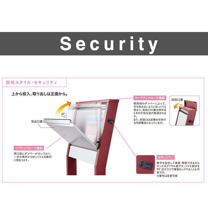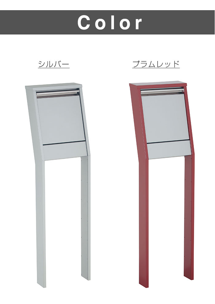 シャープな面持ちと機能性の両立ポスト部分を傾斜させ、郵便物の取り出しやすさとスタイルを追求したスタンドポストそのシャープなラインとスタイリッシュなデザインが、スタンドポストの新たなカテゴリーを切り拓きます▼仕様上から投入、取り出しは正面から▼特徴取出口蓋の開口部にダンパーがついており、一定の場所からゆっくりと自動的に閉まります開閉部のダンパーによって、てを挟まないようゆっくりと閉まり、投函口の蓋を閉める時の不快な音が軽減されます数字を設定して施錠・開錠ができるカムロック式ダイヤル錠ですツマミ部分を90°回すだけで簡易ロックすることも可能です※番号は変更可能▼注意点郵便物を取り出した後は必ず蓋を閉めて施錠して下さい郵便物が過度に多い場合や重量物の場合に取出口蓋が開いてしまう場合があります▼サイズ[閉じたとき]W365×H1237(1537)×D233(mm)[開いたとき]W365×H1339(1639)×D420(mm)[投入口]W265×H40(mm)▼材質[本体]ZAM[取手]ステンレス ▼重量12.2【商品配送時の注意点】こちらの商品は配送日時の指定ができません。